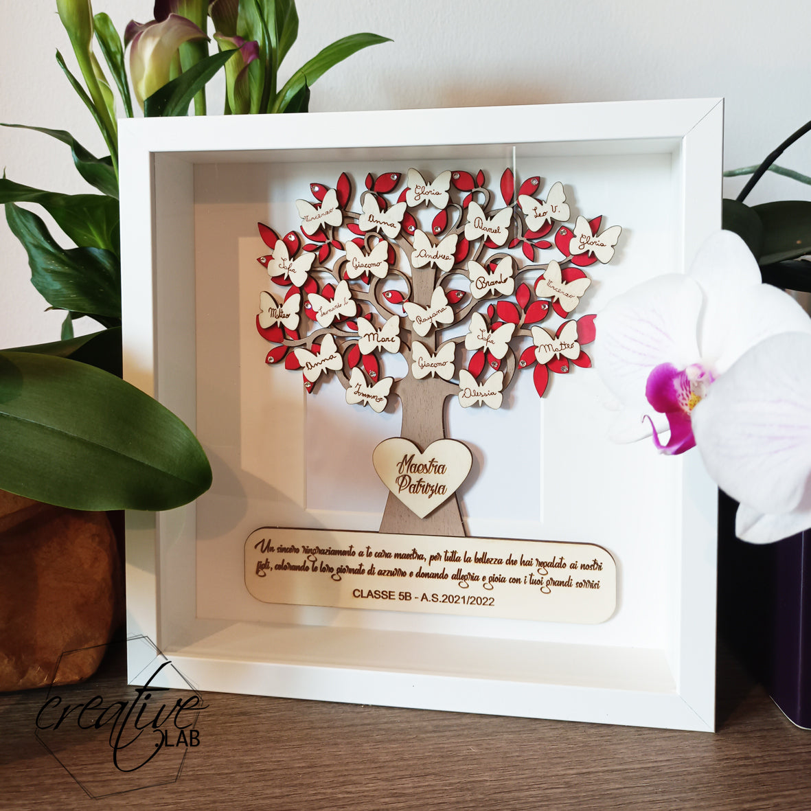 Colori Personalizzabili: Seleziona i colori delle foglie e del cuore per abbinare la cornice al colore della sezione o al colore preferito della maestra. Tabelle colori disponibili tra le immagini del prodotto.