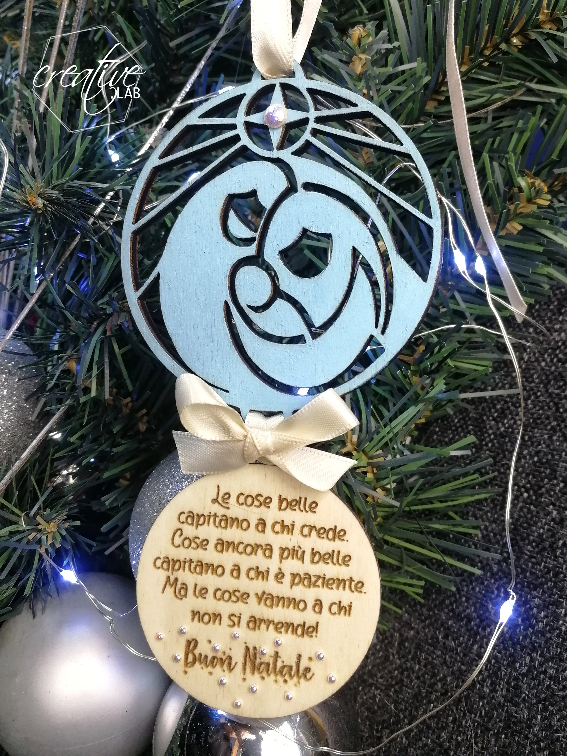 Deliziosa decorazione di legno da appendere all’albero di Natale, raffigurante la Natività, personalizzabile con la dedica per la tua persona cara! Meraviglioso anche come tag da allegare alle tue confezioni regalo di Natale.