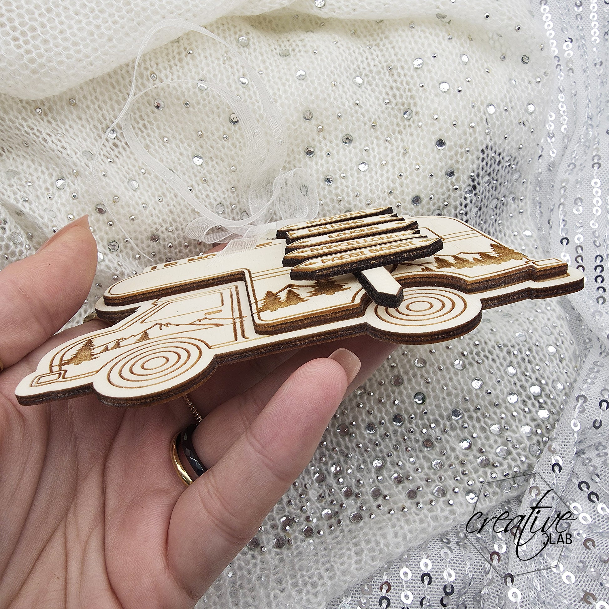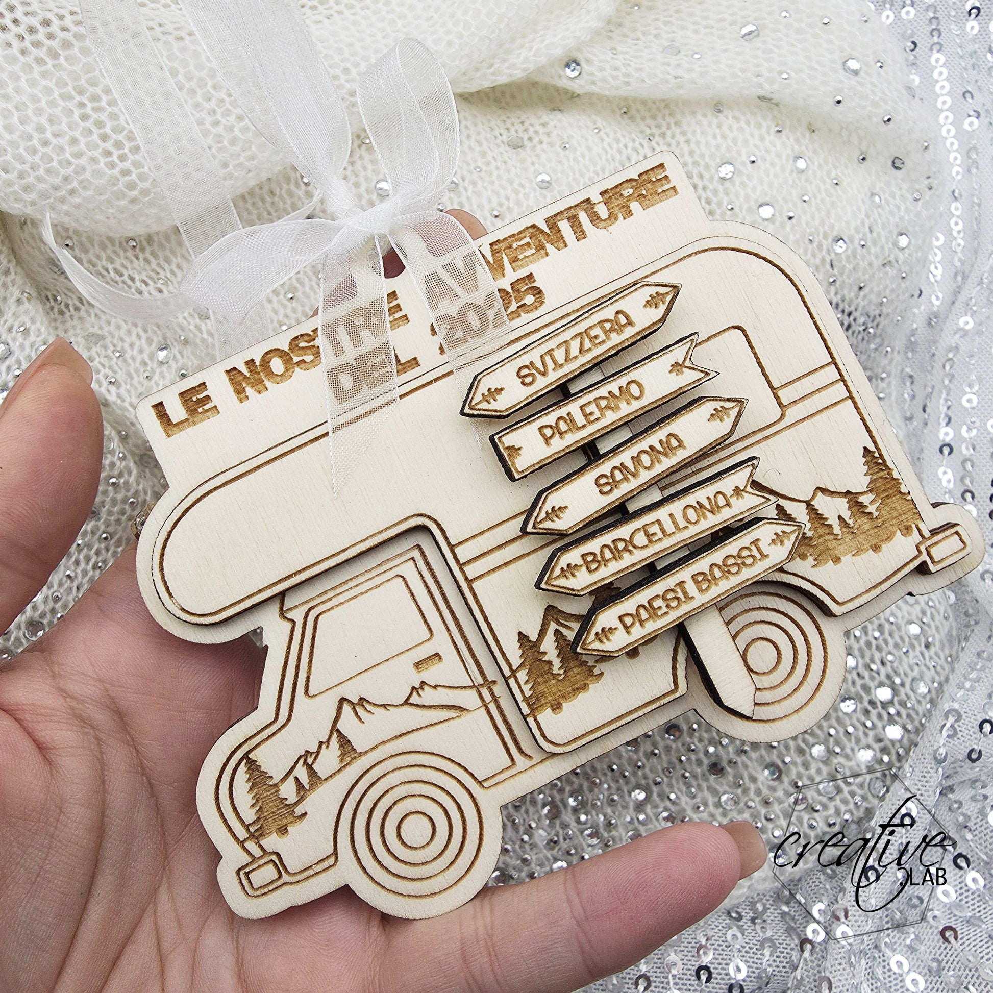 - Pallina in legno a forma di sagoma di camper, disegnata a mano e lavorata a laser, dedicata a chi ama l'avventura