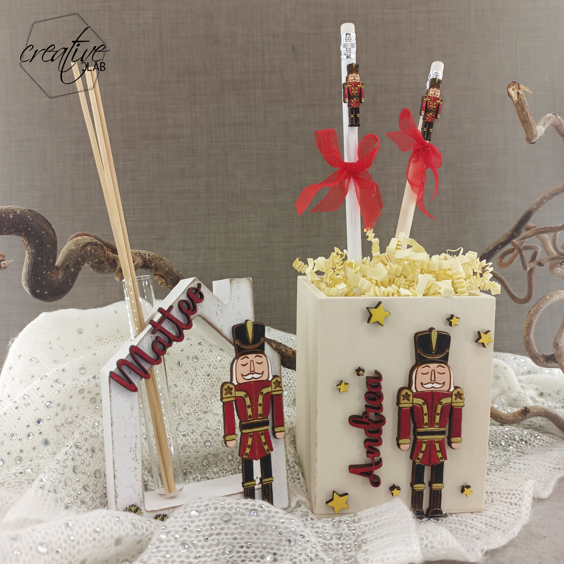 Scopri il nostro esclusivo set natalizio composto da tre pezzi unici: un portapenne elegante, una matita raffinata e un profumatore per ambienti dal profumo avvolgente, tutti impreziositi da un adorabile soldatino natalizio, inciso, intagliato e dipinto a mano.